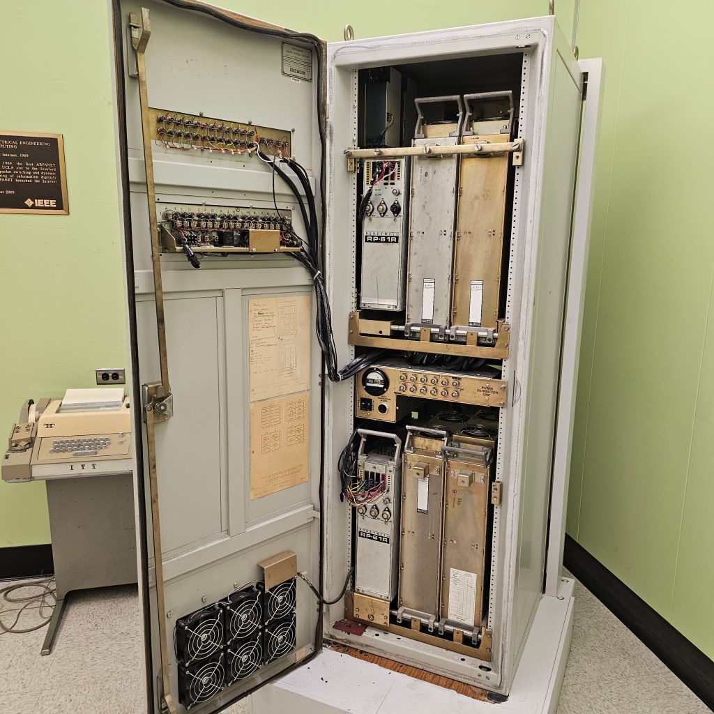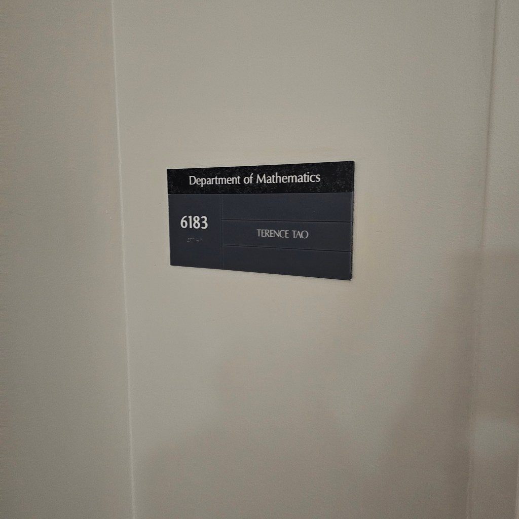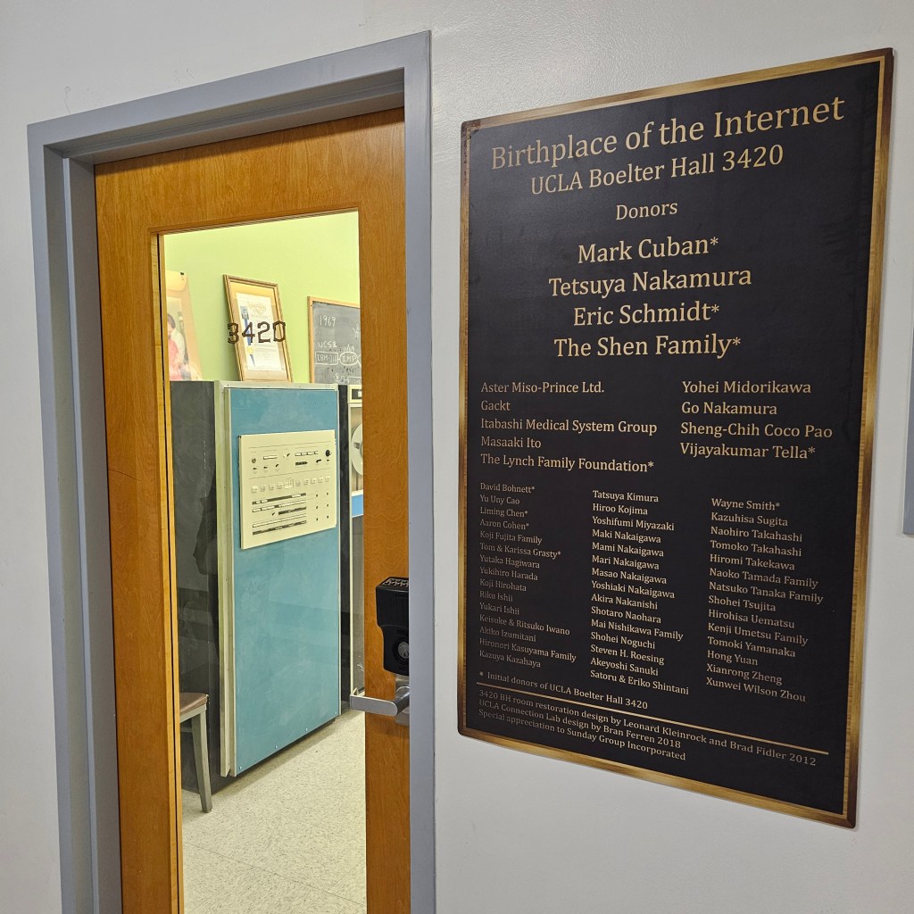 下午再往回跑去參觀UCLA,有個胖子說要吃吃看In-N-Out,只能說味道不錯性價比超高。有幸見到Terence Tao跟Igor Pak…的辦公室(?),還剛好有人介紹了網路的起源,最早發出去的訊息是一群研究生要發login但發完lo之後對面的auto complete造成溢位就停了。